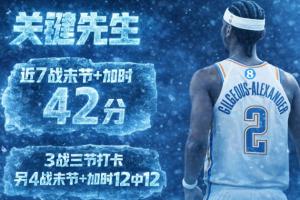 关键先生!亚历山大近7战末节+加时爆轰42分🔥12中12一球未丢!