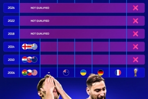 意大利世界杯成绩:2006年之后连续2届小组出局,近3届未进正赛