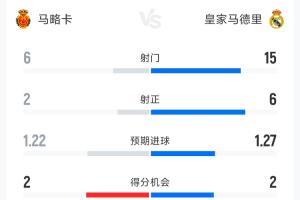 皇马1-2马略卡全场数据:射门15-6,马略卡2射正皆转化为进球