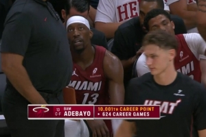 末节还剩5分钟,阿德巴约上篮命中,本场比赛个人砍下第24分;本场比赛之前是9977分,这样一来,他的生涯总得分来到10001分,用了624场比赛。